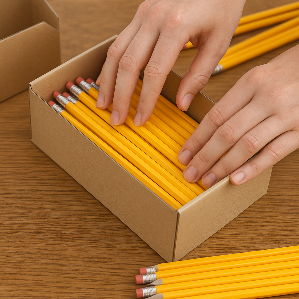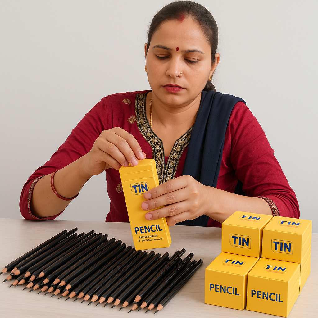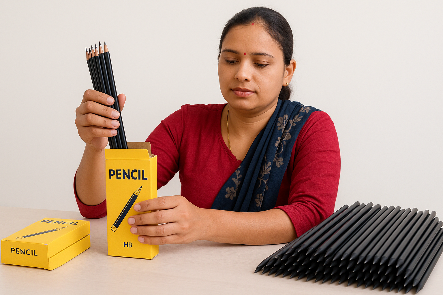 Pencil packing work is a simple small-scale activity where pencils are packed into boxes or pouches as part of the supply process.